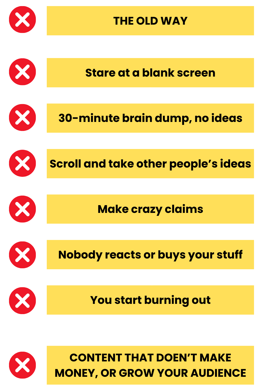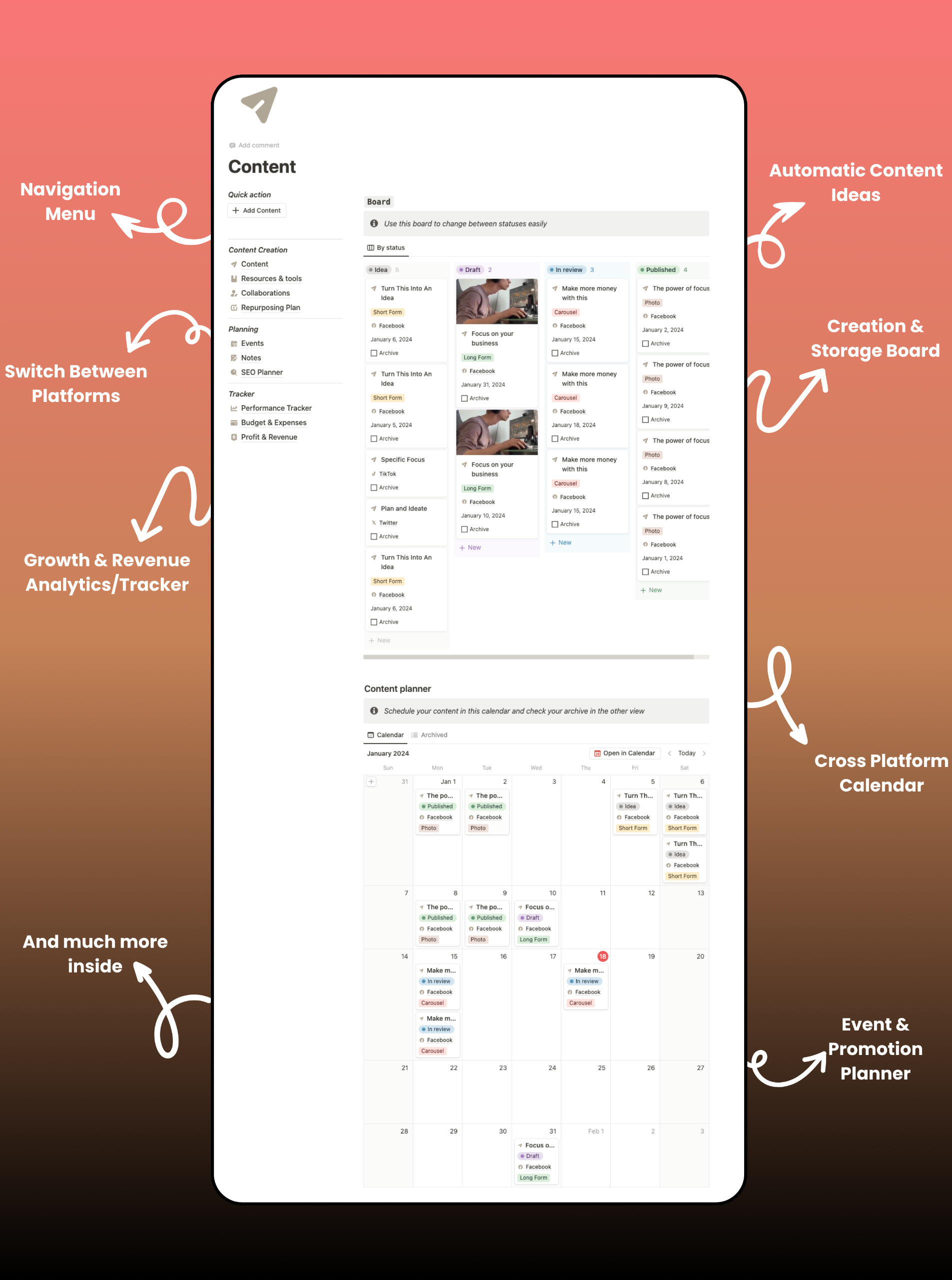 NO MORE:❌ Searching hours on the internet for content ideas to keep your business afloat❌ Aimlessly spraying and praying and hoping that your content pulls in the numbers you're desperately looking for❌ Soul crushing engagement, growth, and money because nothing you post gets results❌ Talking to an empty crowd which usually ends up in most people burning out❌ Unstructured content organization that overwhelms you to the point you don't post anymore