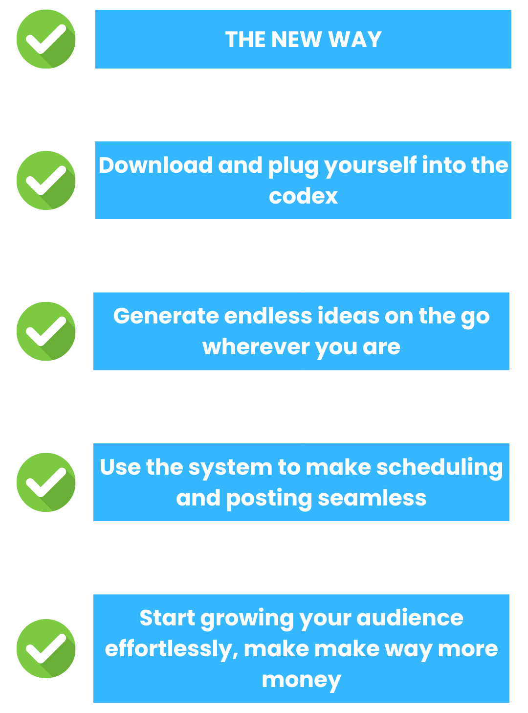 INSTEAD, YOU'LL GET:✅ A "Done For You" content system that even a monkey can operate (no tech experience required)✅ The procedure to turn ONE piece of content into dozens across multiple social media platforms✅ The social media archetypes that are growth and sales-driven (this helps you stay consistent and make more money)✅ The counter-intuitive methods to creating near infinite amounts of content✅ Get your content that stands out, and get read. The Codex will help you show your prospects the benefits of your brand, offer and business✅ The nearly unknown tools that will help you craft faster and better content that will make more money and grow your audience at incredible speedI've spent years building this, and MILLIONS of words have been written during this process.With the help of the Codex, you'll become a content machine across all platforms (including email) and turn unsuspecting people into hardcore fans.
