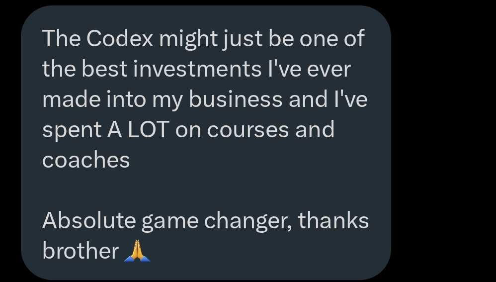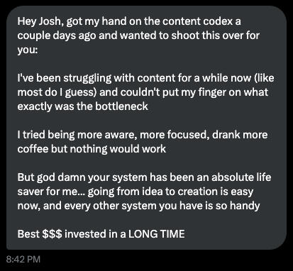 AND THIS STILL WORKS:To this day I'm still writing a bunch of words on a screen that can magically print money.But none of this would have been a reality if I hadn't strategically structured my effort into an automated system that does the heavy lifting for me.That's why I decided to create the Content Codex.I started off 2 years ago. It was just a place for me to stay organized on top of my content, but then I decided to give it away to some private clients.The feedback was amazing, and now you can grab the entire system too right now.It's a place to ideate, create, schedule, and store content.(and a lot more too)