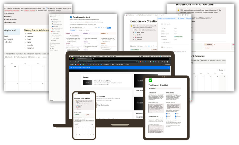 Take your content to the next level:1) Turn simple ideas into countless amounts of tangible content with the help of the built-in ideation machine2) Short on ideas? No problem, plug yourself into the "content directory" and start generating infinite ideas3) Multi-platform built-in scheduler so you don't need to use or pay for various software to schedule your content4) Organize your content using the integrated storage system, accelerating the rate of content production5) In-depth analytics and cross-reference systems to maximize the efficiency and output from each piece of content......and a lot more waiting inside.I can guarantee you that you won't get a better deal than what you're getting right now.Over the years I've bought and built countless systems and none have even come close to this one.But if you join today, you won't just be getting this system; a bunch of cool bonuses are included too...