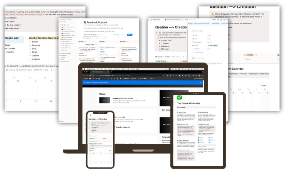 Take your content to the next level:1) Turn simple ideas into countless amounts of tangible content with the help of the built-in ideation machine2) Short on ideas? No problem, plug yourself into the "content directory" and start generating infinite ideas3) Multi-platform built-in scheduler so you don't need to use or pay for various software to schedule your content4) Organize your content using the integrated storage system, accelerating the rate of content production5) In-depth analytics and cross-reference systems to maximize the efficiency and output from each piece of content......and a lot more waiting inside.I can guarantee you that you won't get a better deal than what you're getting right now.Over the years I've bought and built countless systems and none have even come close to this one.But if you join today, you won't just be getting this system; a bunch of cool bonuses are included too...